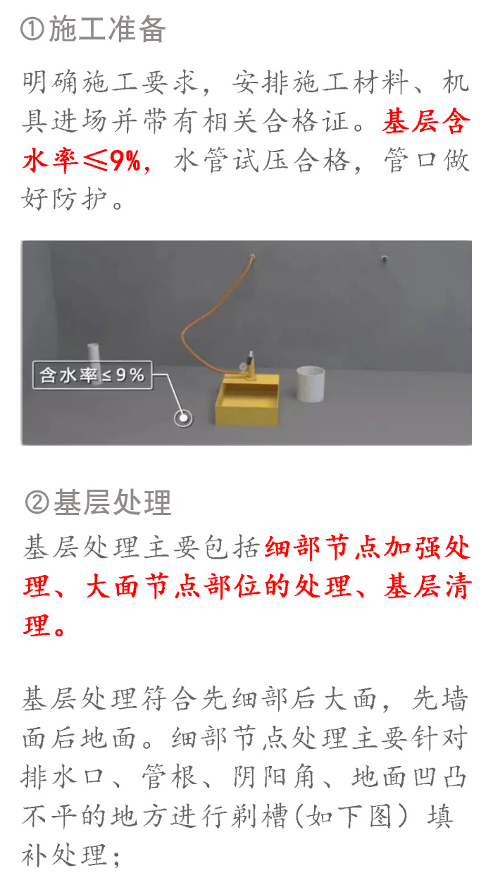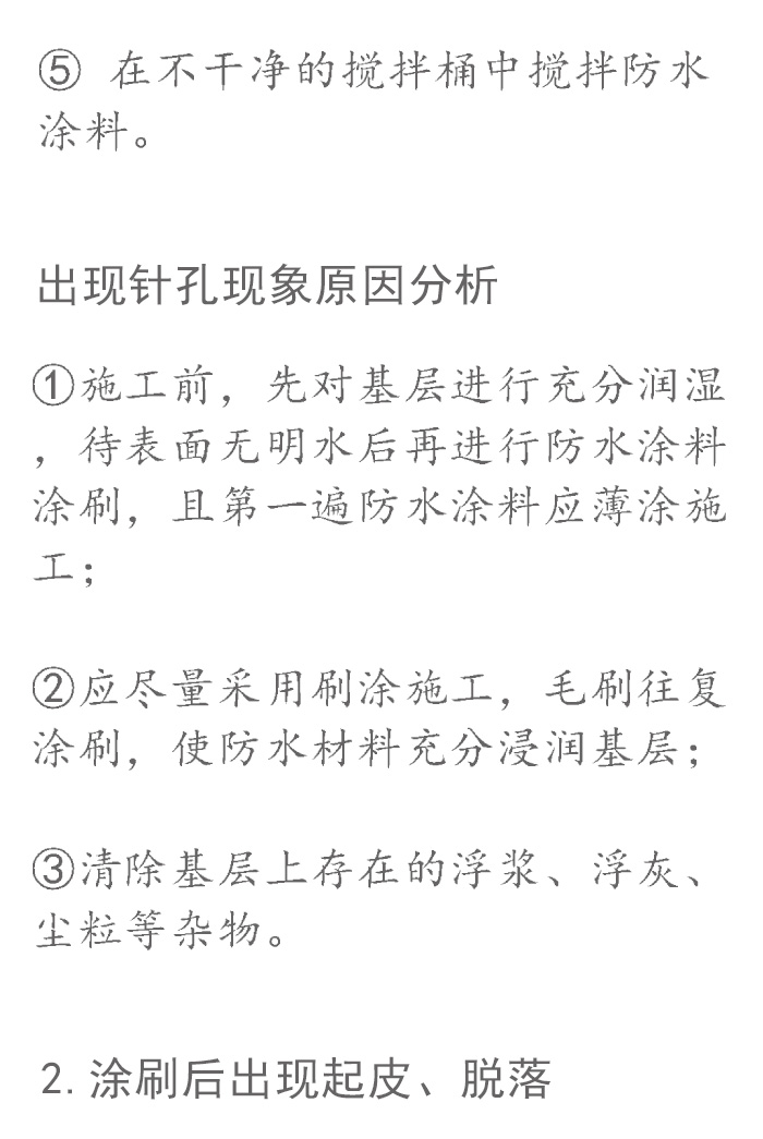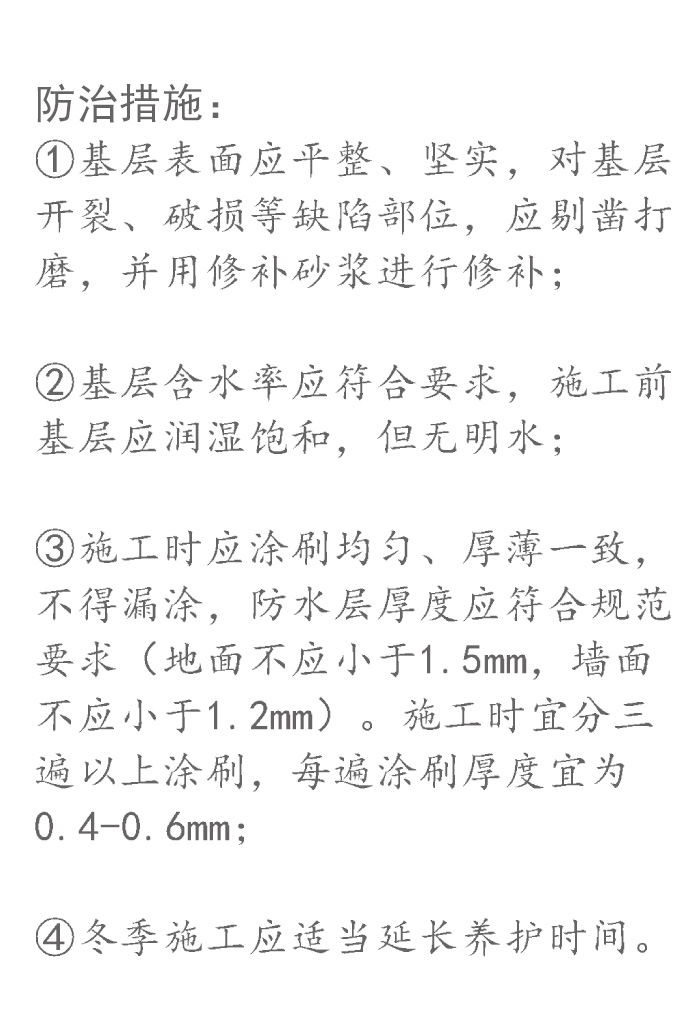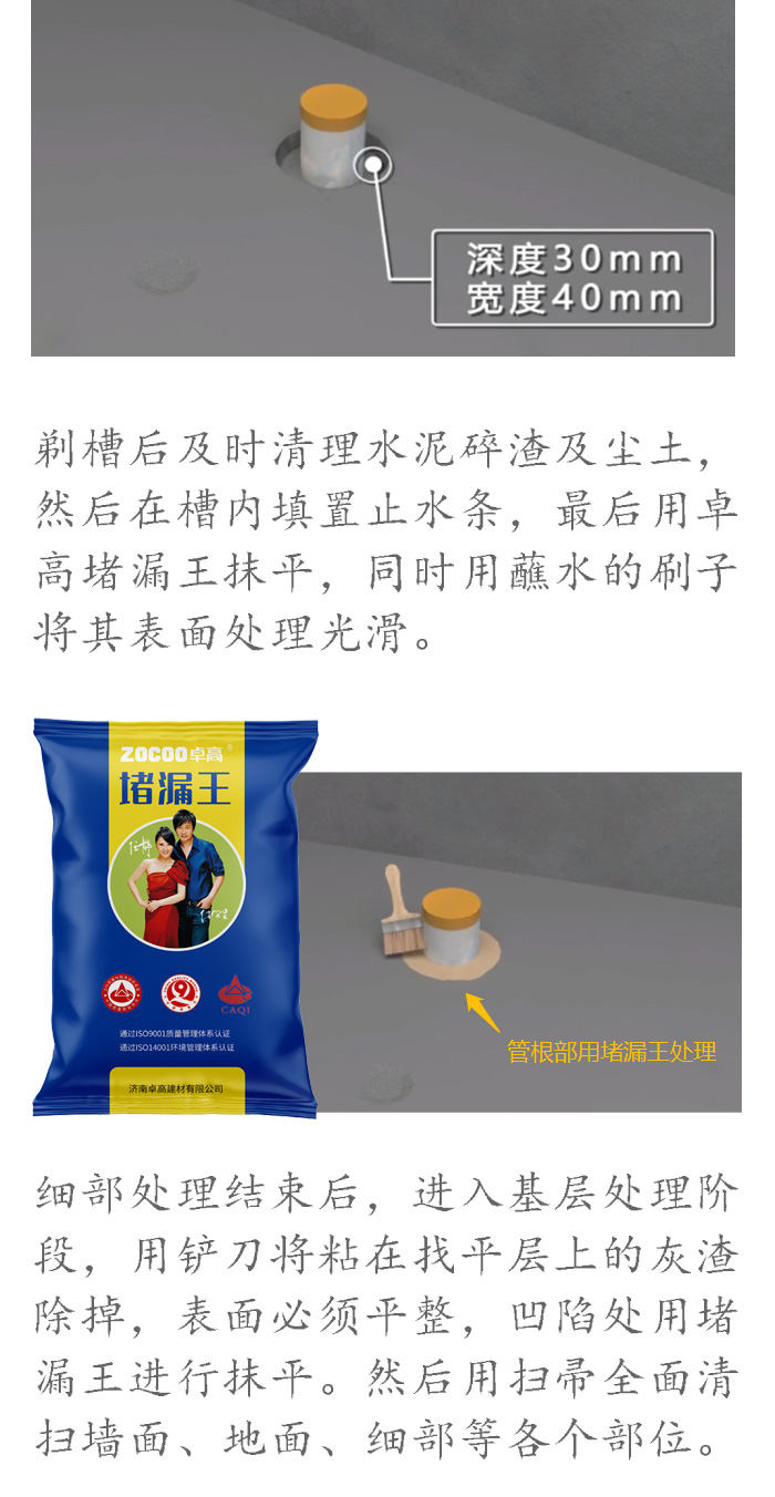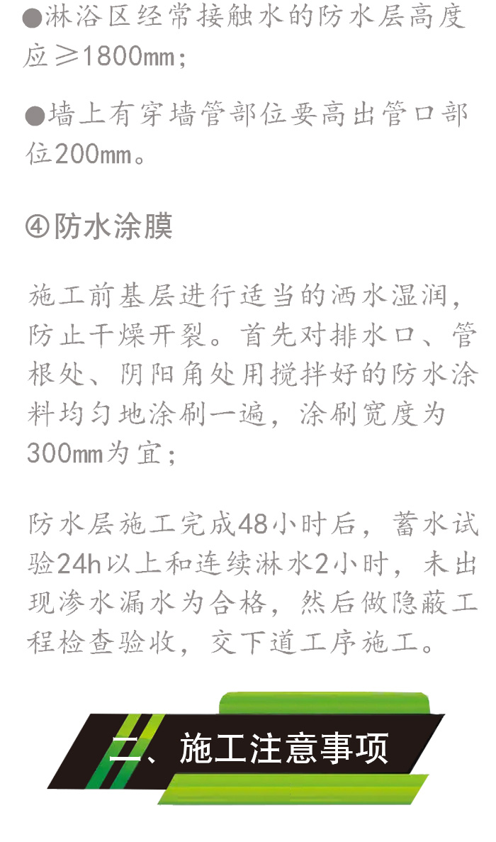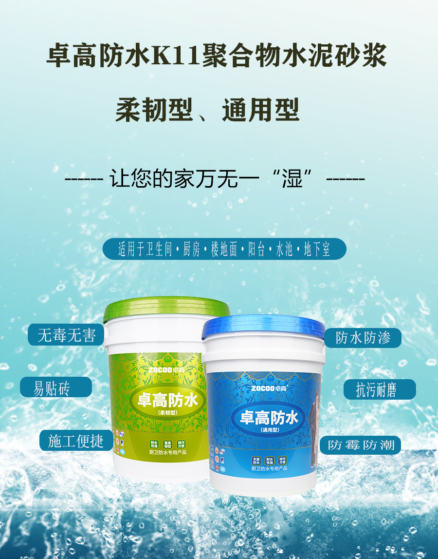 眾所周知,衛(wèi)生間是家庭生活中不可或缺的重要場所。在衛(wèi)生間初裝修的時(shí)候,最最應(yīng)該引起重視的就是防水施工。 如果說花錢花在刀刃上,毫不客氣的說,衛(wèi)生間防水就是裝修刀刃。 它將直接影響衛(wèi)生間的使用壽命、使用性能、功能以及便利程度。一旦發(fā)生滲漏,動輒需要敲開返工,修復(fù)會非常麻煩,而且還會影響日常生活及鄰里關(guān)系! 今天,小編從防水施工工藝、施工注意事項(xiàng)、常見質(zhì)量通病解析3個(gè)方面對衛(wèi)生間防水施工進(jìn)行分析,計(jì)劃裝修的你、從事防水施工的你快拿小本本記好嘍! 導(dǎo)致衛(wèi)生間出現(xiàn)漏水問題的原因很多:設(shè)計(jì)、材料、施工……任何一處的環(huán)節(jié)的質(zhì)量不過關(guān),都有可能導(dǎo)致衛(wèi)生間在交付使用后出現(xiàn)漏水現(xiàn)象。選對材料,便是裝修成功一個(gè)好的開始。 卓高防水是由優(yōu)質(zhì)水泥、級配骨料、聚合物及多種環(huán)保功能助劑制備的一款開桶即用型防水涂料。具強(qiáng)度高、氣密性好、施工手感好的特點(diǎn),同時(shí)還具有柔性好的特點(diǎn),可抵御基層細(xì)微裂紋和微小位移,非常適合室內(nèi)的精裝修。 家裝防水是室內(nèi)裝修中最不能忽視卻又最容易忽視的一項(xiàng)工程,人們總是在漏了水以后才會感嘆可得長點(diǎn)兒心了,希望通過這篇文章,能夠幫大家選擇到合適的防水涂料,確保家居裝修“萬無一濕”。